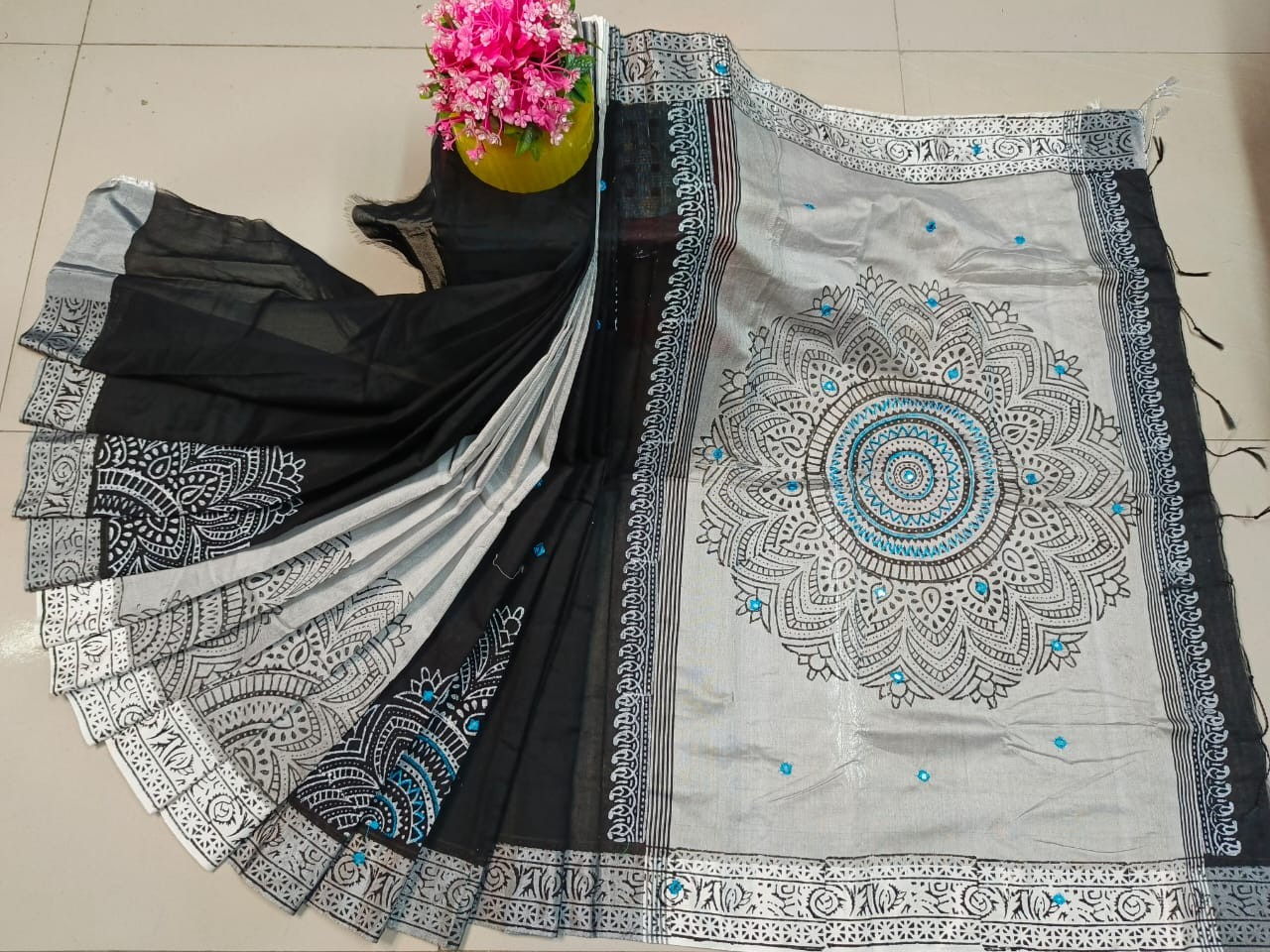 ♻ ব্লক প্রিন্ট ও এমব্রয়ডারি কাজ + শাড়িতে গ্লাস বসানো আছে